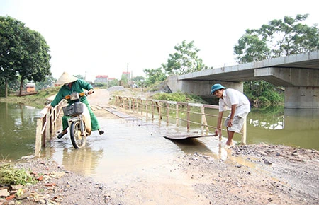 Theo người dân, khi cầu mới đang thi công, nhà thầu cũng đã cho xây một chiếc cầu tạm bên cạnh. Tuy nhiên, do xây dựng ở địa hình thấp, mỗi khi mưa to cây cầu này đều bị ngập chìm.