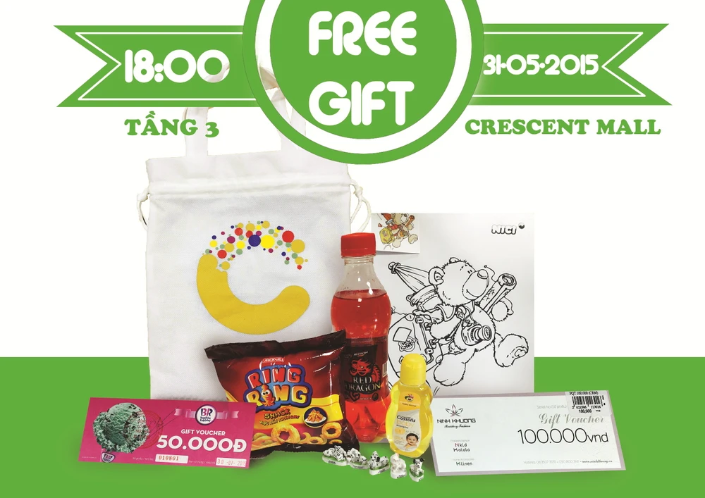 Theo đó, từ 18 giờ đến 19 giờ, ngày 31-5, Crescent Mall phát tặng 500 phần quà đặc biệt dành riêng cho 500 bé dưới 12 tuổi đến trung tâm đầu tiên, nhân ngày Quốc tế thiếu nhi. Để nhận quà, bố mẹ chỉ cần giúp bé điền đầy đủ thông tin vào phiếu tại quầy thông tin ở tầng trệt. Sau đó cùng với bé di chuyển lên tầng 3 để nhận quà. Với mỗi túi quà, bé sẽ nhận được một phần bánh và nước ngọt từ Jack’n Jill, sữa tắm từ Cussons Baby, tranh tô màu ngộ nghĩnh từ Nici, đồ chơi đáng yêu của Minh Long và nhiều phiếu quà tặng hấp dẫn khác từ Ninh Khương, Baskin Robins.