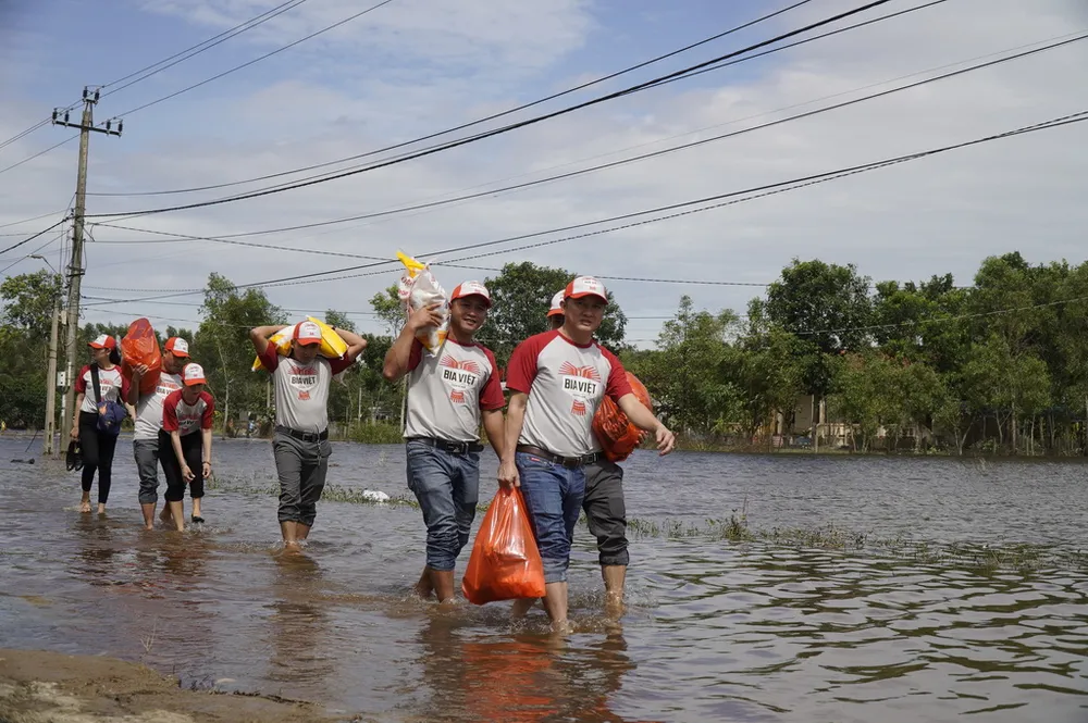 Các tình nguyện viên của Bia Việt đi trao quà cứu trợ cho người dân tỉnh Quảng Trị
