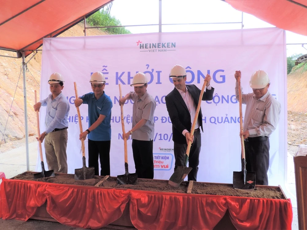 Đại diện chính quyền địa phương và Heineken Việt Nam khởi công xây dựng công trình nước sạch cho bà con thôn Trà Linh Tây.
