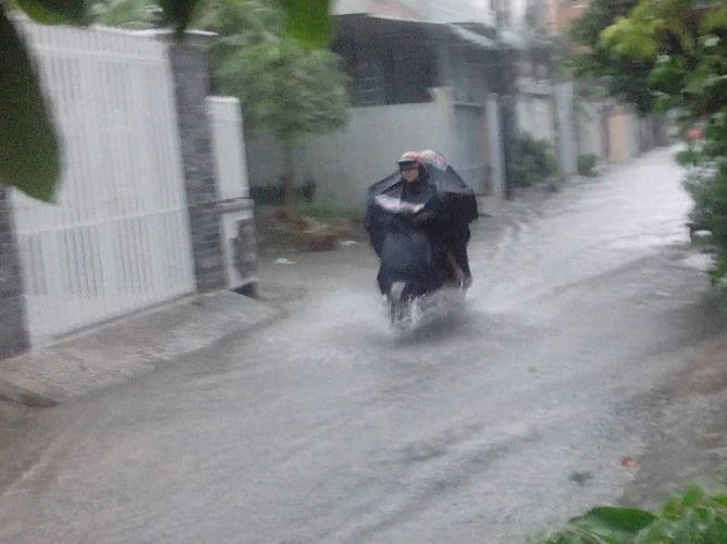 Có nơi nước ngập cao hơn vỉa hè khiến người đi xe không phân biệt được mặt đường và vỉa hè nên bị trượt bánh xe xuống cống. Trận mưa kéo dài đến giờ tan tầm đã gây khó khăn cho nhiều người khi đi làm về, nhiều phụ huynh đón con đi học về cũng khó khăn để di chuyển trên đường.