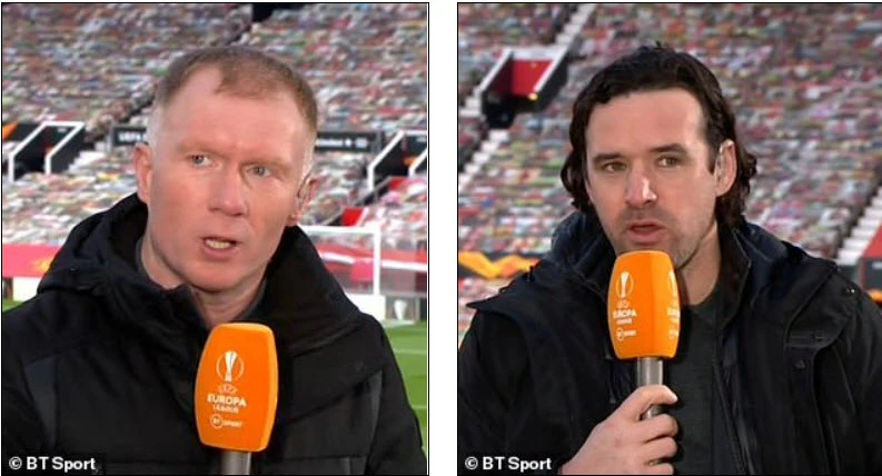 Scholes và Hargreaves bình luận trận đấu trên BT Sport. ẢNH: BT SPORT