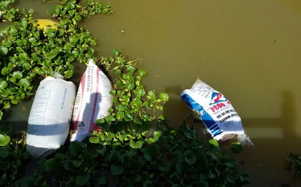 Các bao tải đầy heo chết được vứt trên kênh ngay trong vùng dịch. Ảnh: THANH NHẬT.