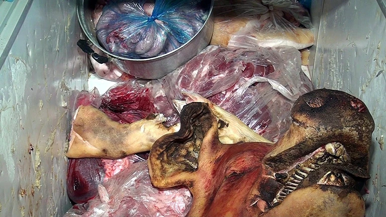 Toàn bộ số thịt này không có giấy chứng nhận kiểm dịch. Cơ sở của ông Tuấn cũng không có giấy phép giết mổ động vật. Đại diện cơ quan thú y và tổ kiểm tra xác nhận số thịt này không phải là thịt heo rừng, trên bề mặt thịt có dịch nhớt và có mùi hôi thối, thịt có màu tái nhợt. Đặc biệt có một số loại thịt như vú heo đã chuyển sang màu thâm đen.