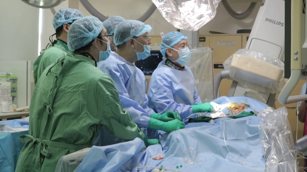 Một ca thủ thuật thay van động mạch chủ qua da cho người bệnh tại BV ĐHYD. Ảnh: NP