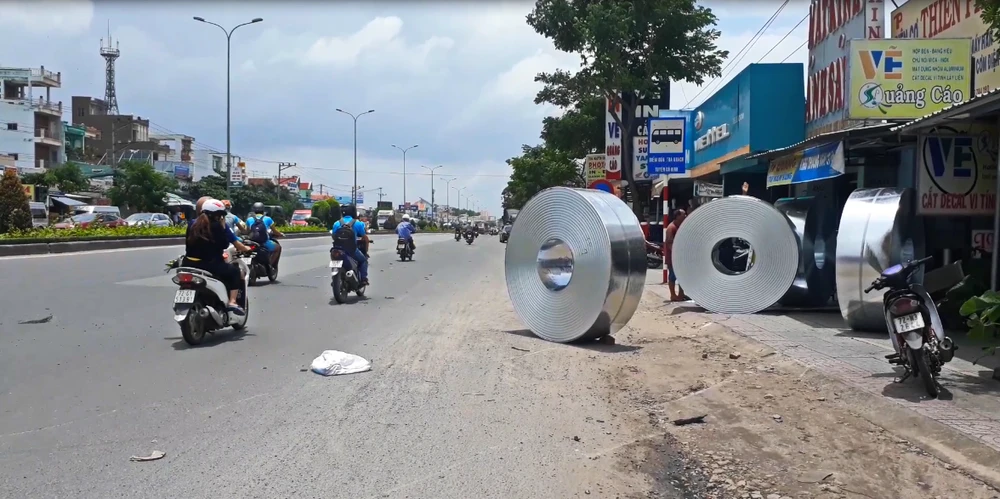 Theo người dân khu vực trên, mỗi ngày có hàng trăm lượt xe chở tôn, sắt, phế liệu và dăm gỗ vào KCN. Tuy nhiên, xe không được ràng buộc kỹ, chỉ kê lên các cuộn tôn, sắt vài tấm gỗ sơ sài nên xảy ra tình trạng các cuộn tôn, sắt rơi xuống đường gây nguy hiểm cho người đi đường.