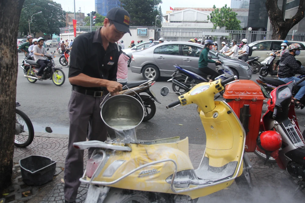 Chị A. phát hiện chiếc xe bốc khói nghi ngút, vì hoảng sợ nên chị đã rồ ga chạy lên lề đường. Đến lúc này, phần yên xe đã bốc cháy ngùn ngụt.