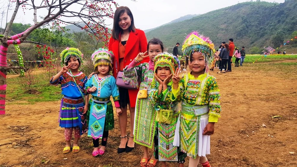 Nhiều bạn trẻ thích thú chụp ảnh với đồng bào người Mông.
