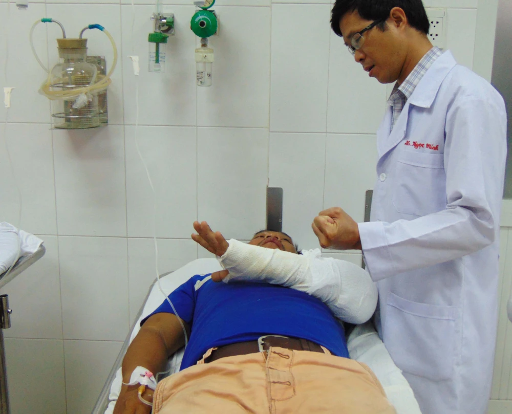 Anh Hòa đang được bác sĩ kiểm tra tay gãy. Ảnh: TRẦN NGỌC