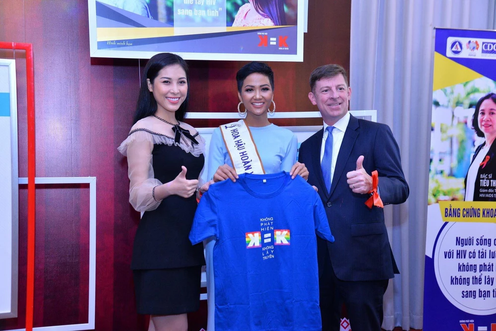 H'Hen Niê với dải băng đỏ trên tay truyền thông về việc phòng, chống và giúp đỡ người nhiễm HIV/AIDS.