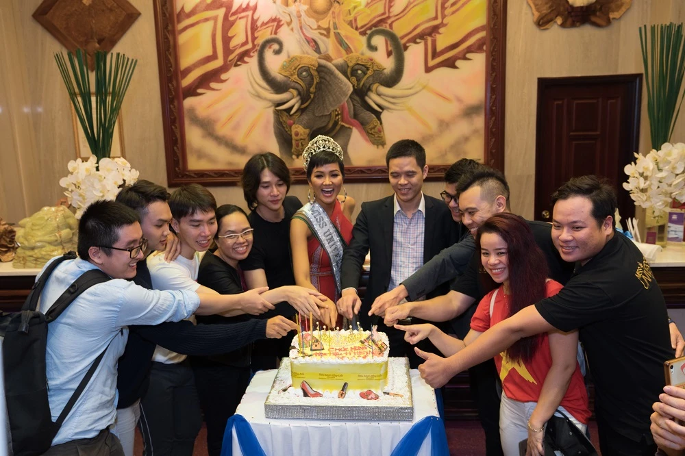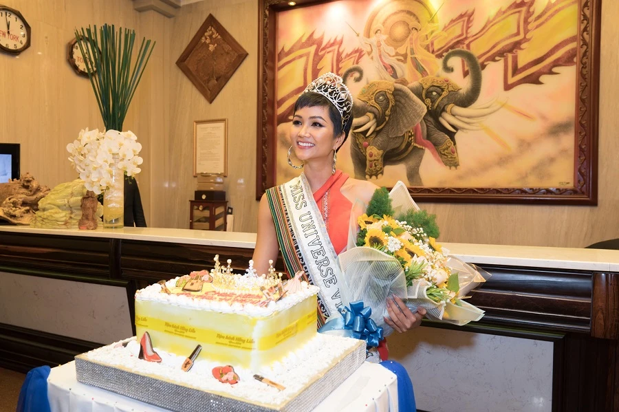 BTC Hoa hậu Hoàn vũ Việt Nam đã chuẩn bị chiếc bánh kem rặng H'Hen đánh dấu một năm cô đăng quang HHHV Việt Nam