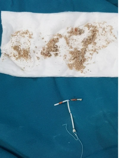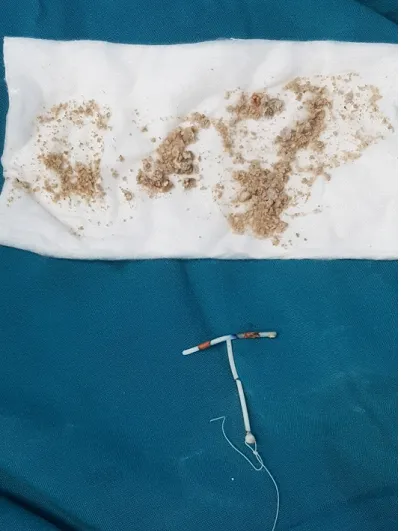 Trước đó, chị D. bị tiểu buốt, tiểu rắt và đau bụng. Khi đến khám thì phát hiện sỏi bàng quang to bằng ngón chân cái (hơn 2,2 cm) bao quanh một nhánh của vòng tránh thai chữ T. Chị D. cho biết vòng tránh thai được đặt đến nay hơn 8 năm.