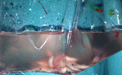Mặc dù bệnh nhân được làm vệ sinh nhiều lần, nhưng không thể lấy hết giòi do chúng đã đào đường hầm rất sâu dưới vết mổ cũ. Bệnh nhân sau đó được chuyển mổ cấp cứu, mở rộng vết mổ cũ, làm sạch tổ chức mủ và giòi.