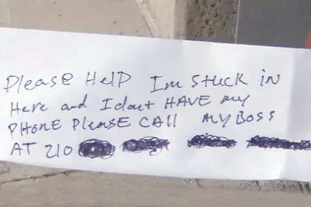 Do để quên điện thoại trên xe, anh này không biết làm cách nào để kêu cứu với người bên ngoài. Cuối cùng, anh dùng cách ghi lời kêu cứu trên biên lai rồi trượt thông điệp qua khe rút tiền hòng có người nào đó có thể giúp anh ra ngoài. "Làm ơn giúp, tôi bị kẹt trong này và không mang theo điện thoại, vui lòng gọi cho sếp của tôi với số máy này", anh viết.