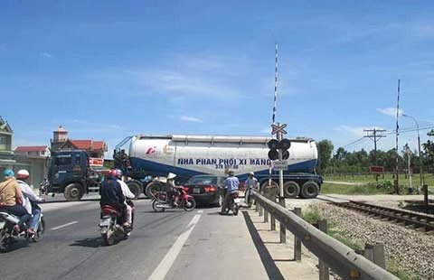 Quốc lộ 1A và đường sắt sát nhau, khi xe tải từ đường ngang ra vào quốc lộ 1A (đoạn huyện Nghi Lộc, Nghệ An) làm tắc luôn cả quốc lộ và đường sắt Bắc-Nam. Ảnh: Đ.LAM