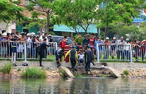 Lực lượng cứu nạn, cứu hộ lặn tìm vớt xác nạn nhân nhảy xuống kênh Tàu Hủ rồi bị đuối nước vào ngày 17-6 vừa qua. Ảnh: HT
