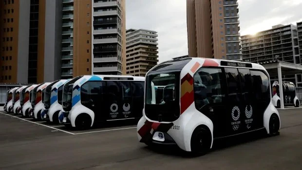 Đội xe điện tự lái trong làng VĐV bị tạm ngừng hoạt động vì sự cố của Kitazono. Ảnh: Asahi.