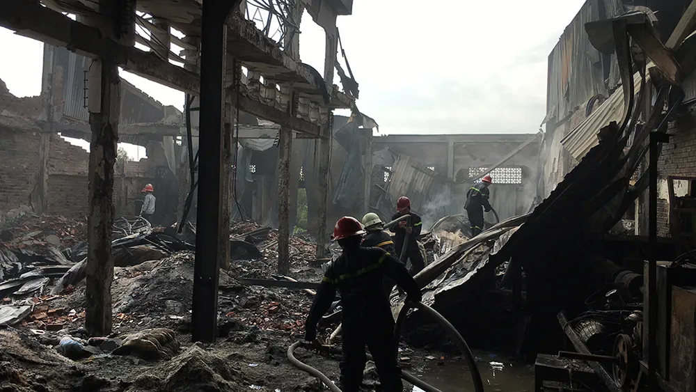 Hỏa hoạn khiến nhà xưởng đổ sập. Ảnh: Nguyễn Tân