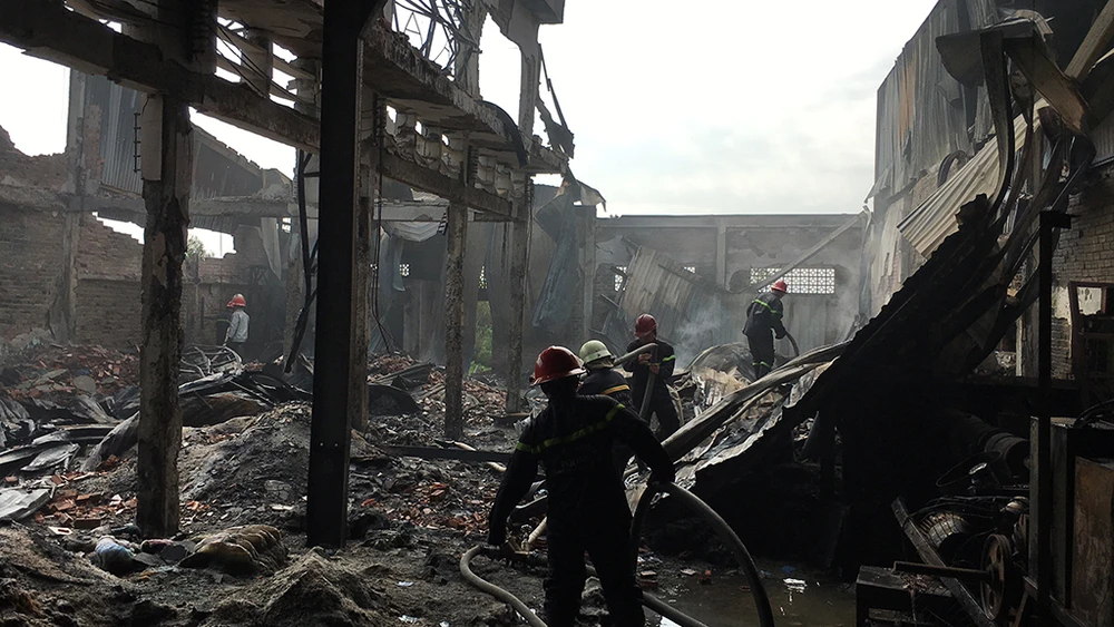 Do khu vực xưởng kín, chứa nhiều hàng hóa, vật liệu dễ cháy nên công tác dập lửa gặp không ít khó khăn. Cảnh sát chia nhiều hướng, tiếp cận, bơm nước từ kênh gần đó để phục vụ chữa cháy.