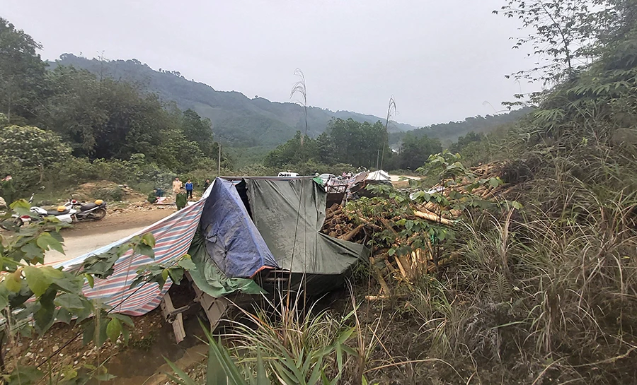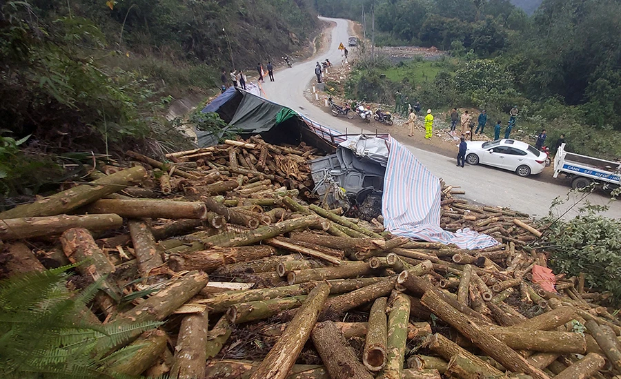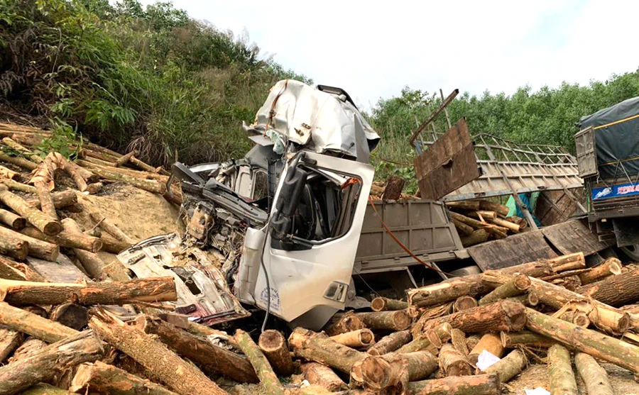 Sau khi đâm vào vách núi, gỗ keo bung ra khỏi thùng xe tràn lên phía núi.