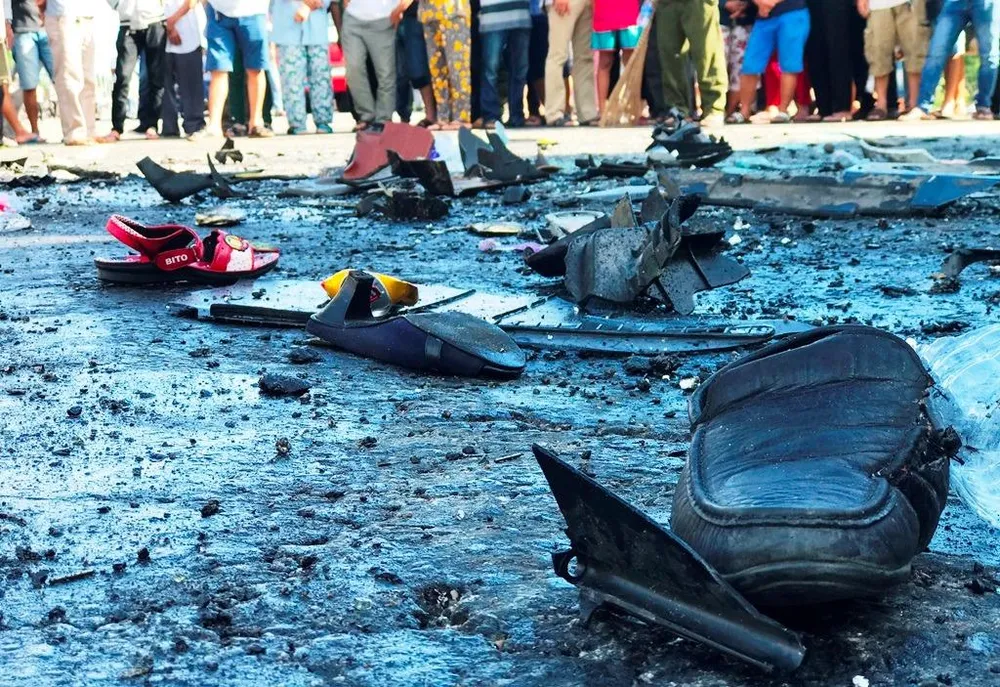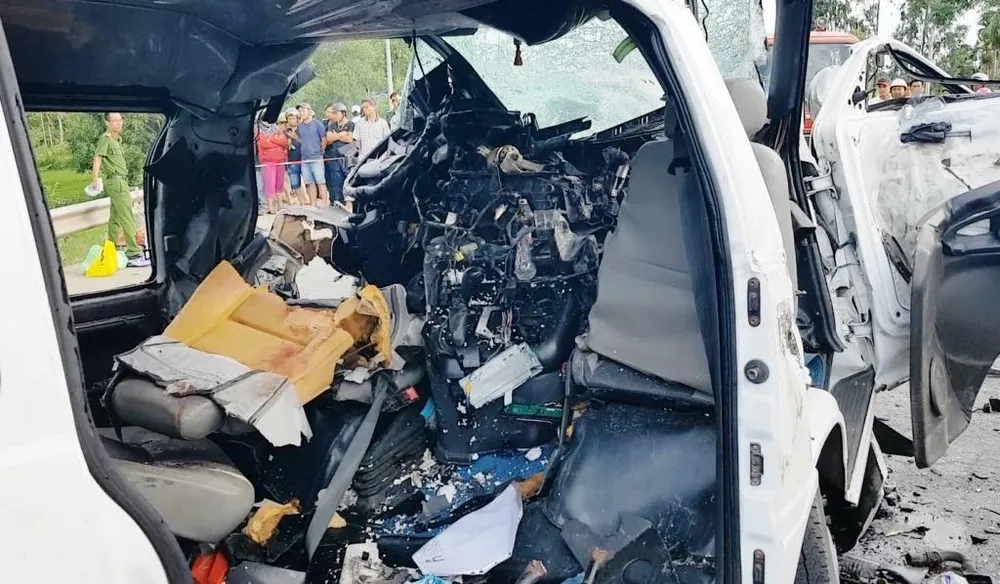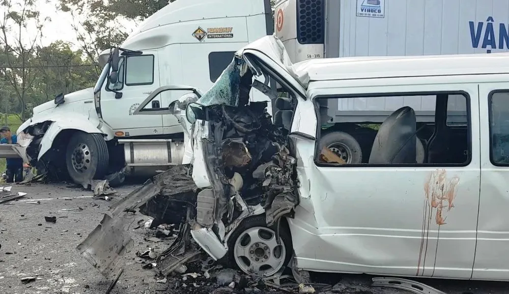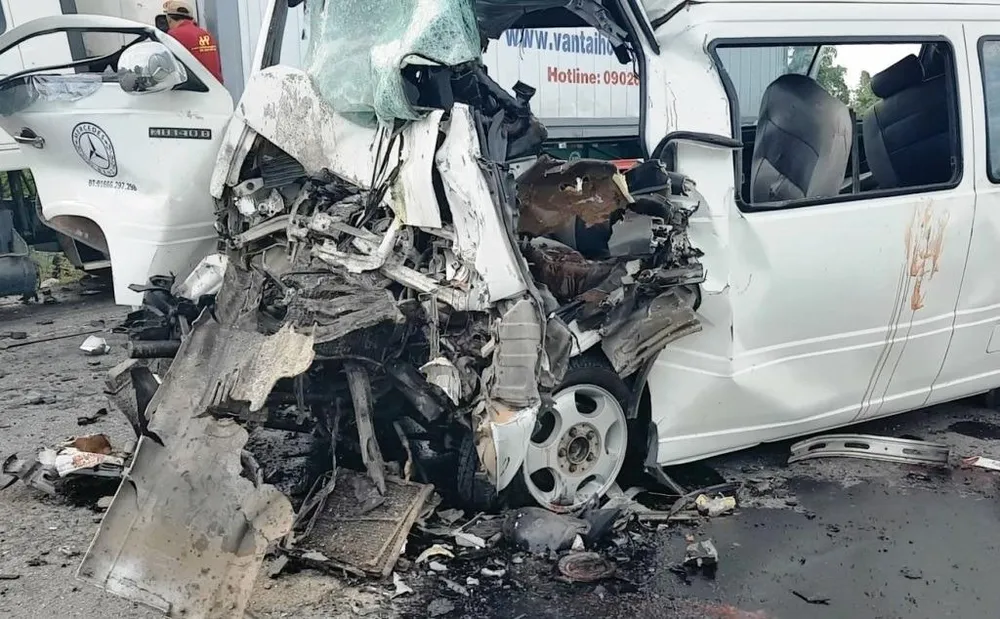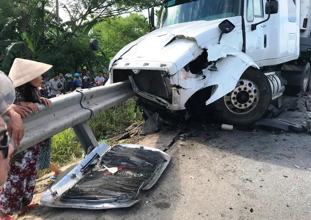 Cú tông mạnh tạo nên một tiếng động mạnh như bom nổ. Đầu xe khách nát bét, có nạn nhân văng ra khỏi xe tử vong.
