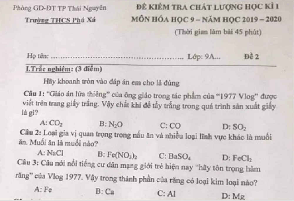 Câu 1: “Giáo án lửa thiêng” của ông giáo trong tác phẩm của "1977 Vlog" được viết trên trang giấy trắng. Vậy chất khí để tẩy trắng trong quá trình sản xuất giấy là gì?