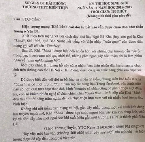 Trong đó, câu 1 (3 điểm) có chủ đề “Hiện tượng Khá “bảnh” với đời tư bất hảo vẫn được chào đón như thần tượng ở Yên Bái”.