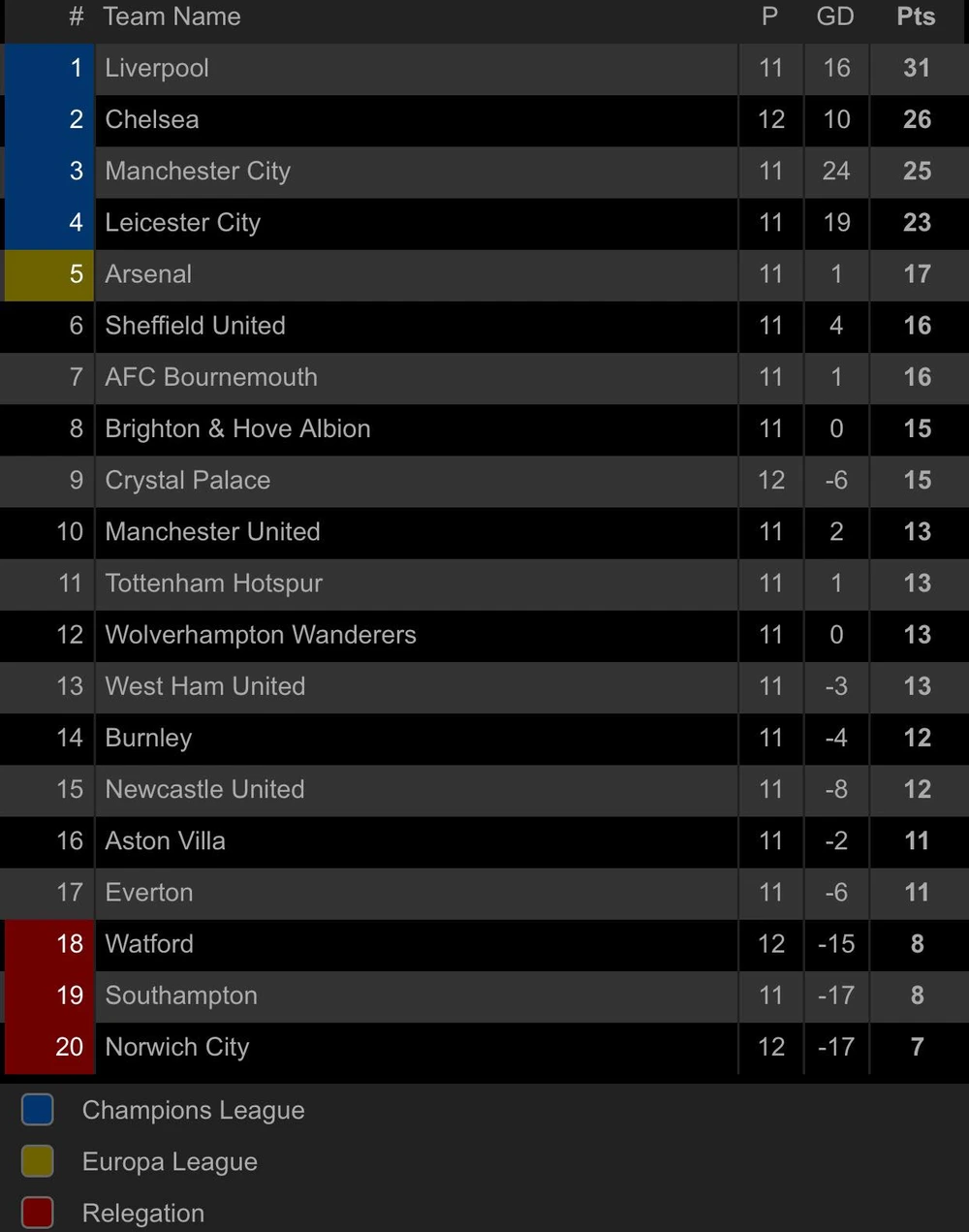 Với hiệp 2 thi đấu bùng nổ, Chelsea giành trọn 3 điểm tại vòng 12 Premier League. Đánh bại Crystal Palace với tỉ số 2-0, Chelsea tạm vươn lên vị trí thứ hai với 26 điểm, hơn Man. City 1 điểm nhưng đá sớm hơn “Man xanh”. Tại vòng 12 Premier League, Leicester City phải đối đầu với Arsenal, còn Man. City phải “đụng độ” với Liverpool trên sân Anfield.