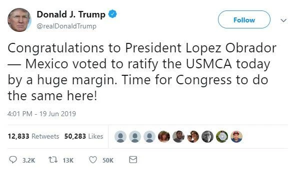 “Chúc mừng Tổng thống Lopez Obrador - Mexico đã bỏ phiếu phê chuẩn USMCA hôm nay bằng chiến thắng áp đảo. Đã đến lúc Quốc hội Mỹ cần làm điều tương tự!”, Tổng thống Trump viết trên Twitter.