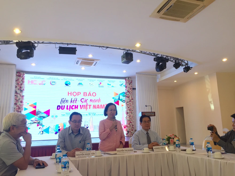 Bà Nguyễn Thị Khánh, Phó Chủ tịch thường trực Hiệp hội Du lịch TP.HCM phát biểu tại họp báo Liên kết sức mạnh du lịch Việt Nam tháng 7 (Ảnh TÚ UYÊN)