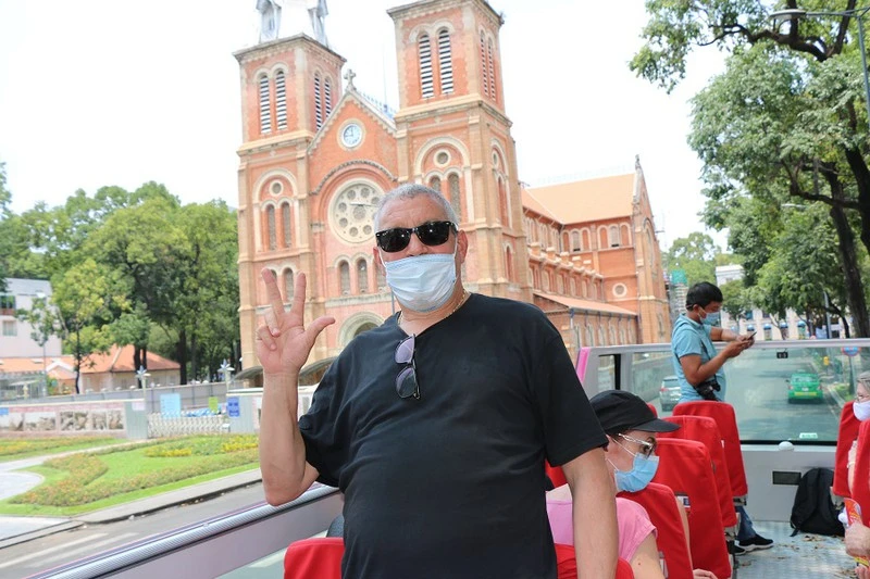 Du khách tham quan TP.HCM bằng xe buýt hai tầng. ẢNH: K.LUÂN