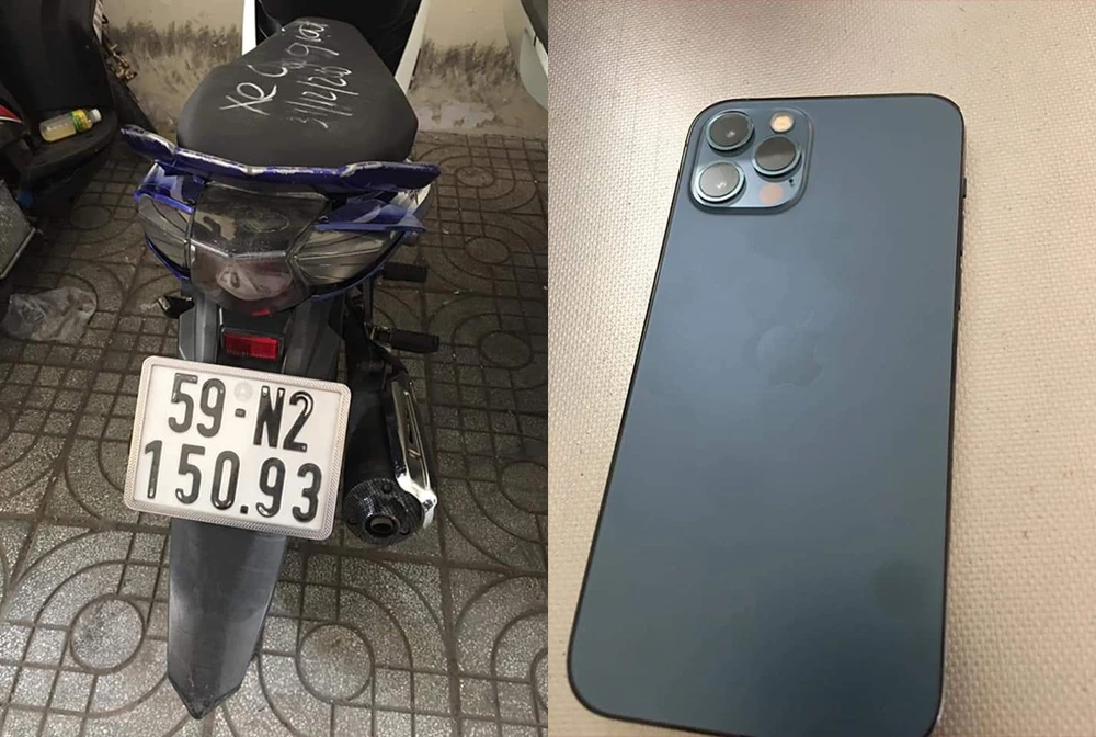 Điện thoại tang vật cùng chiếc xe mà Long sử dụng để cướp giật. Ảnh: Đ.C