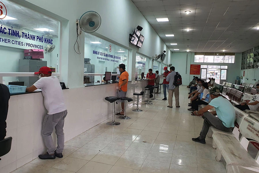 Người dân đi đổi biển số màu vàng cho xe kinh doanh vận tải tại TP.HCM. Ảnh: THY NHUNG