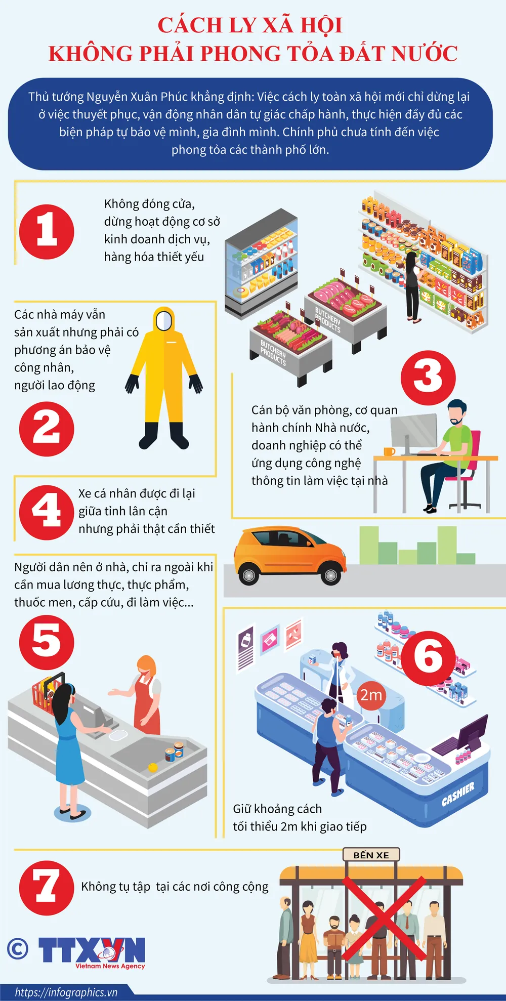 Giải thích thêm về Chỉ thị này, Thủ tướng Nguyễn Xuân Phúc nêu rõ cách ly xã hội là một tình huống pháp lý không trái pháp luật để bảo vệ sức khỏe, tính mạng của nhân dân. Cách ly xã hội mang ý nghĩa là giữ khoảng cách trong xã hội để đối phó với tình huống nguy hiểm, bùng phát dịch bệnh, giữ khoảng cách giữa người với người, cộng đồng với cộng đồng, không phải là ngăn cấm giao thông, không phải là “ngăn sông cấm chợ”, chưa phải phong tỏa xã hội. “Điều quan trọng là đảm bảo an toàn cho người lao động” - Thủ tướng nêu rõ.
