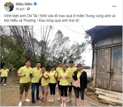 Trước đó, khi nghe tin nghệ sĩ Chí Tài qua đời, trên trang cá nhân, Hiếu Hiền chia sẻ: "Vĩnh biệt anh Chí Tài ! Mới vừa đi trao quà ở miền Trung cùng anh và hội Hiểu và Thương ! Đau lòng quá anh trai ơi!".