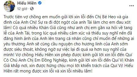 Trên trang cá nhân, Hiếu Hiền đã lên tiếng xin lỗi: "Trước tiên vợ chồng em muốn gửi lời xin lỗi đến Chị Bé Heo và gia đình của Anh Chị! Sự ra đi đột ngột của anh Tài làm cho em đau xót lắm!
