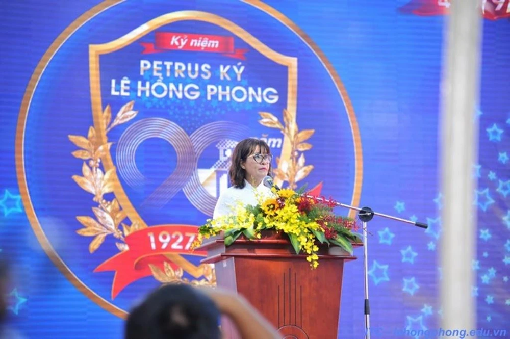 Bà Nguyễn Thị Yến Trinh - Bí thư chi bộ, Hiệu trưởng trường THPT Lê Hồng Phong phát biểu tại lễ kỷ niệm 90 năm thành lập trường. Ảnh: Website trường THPT Lê Hồng Phong
