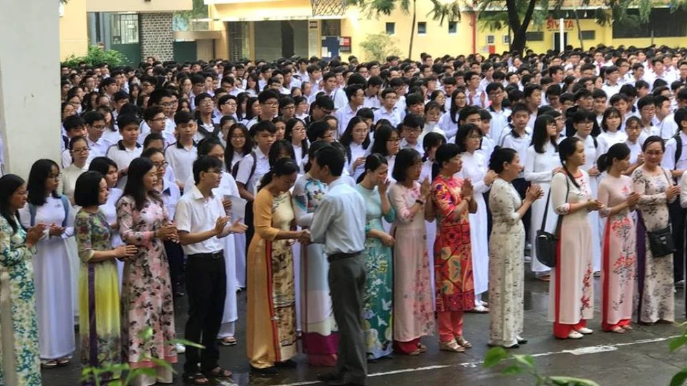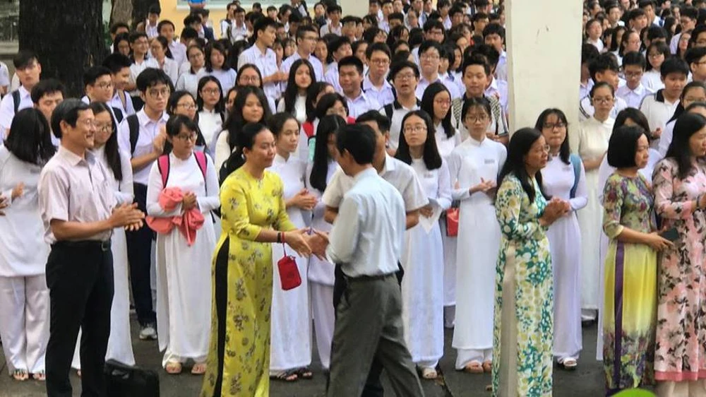 Sáng 4-10, Trường THPT chuyên Trần Đại Nghĩa, TP.HCM tổ chức lễ chia tay Hiệu trưởng Lâm Triều Nghị khi ông chuyển công tác về Trường THPT Nguyễn Thượng Hiền.