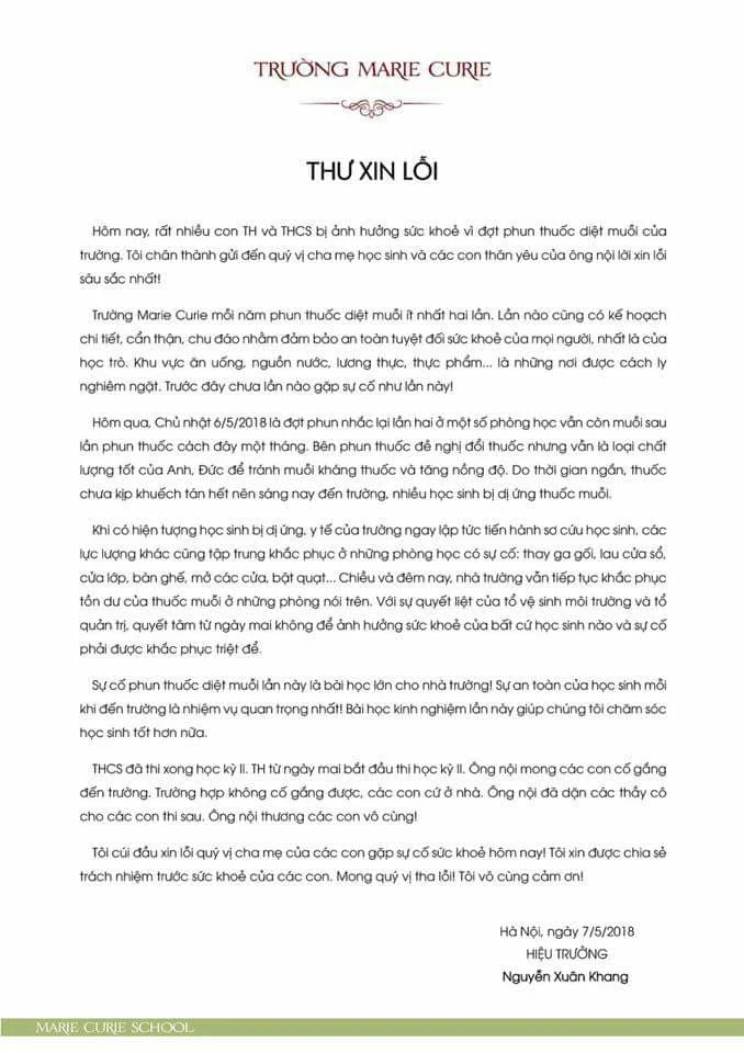 Bức thư xin lỗi gửi tới phụ huynh học sinh và học sinh của thầy hiệu trưởng Nguyễn Xuân Khang