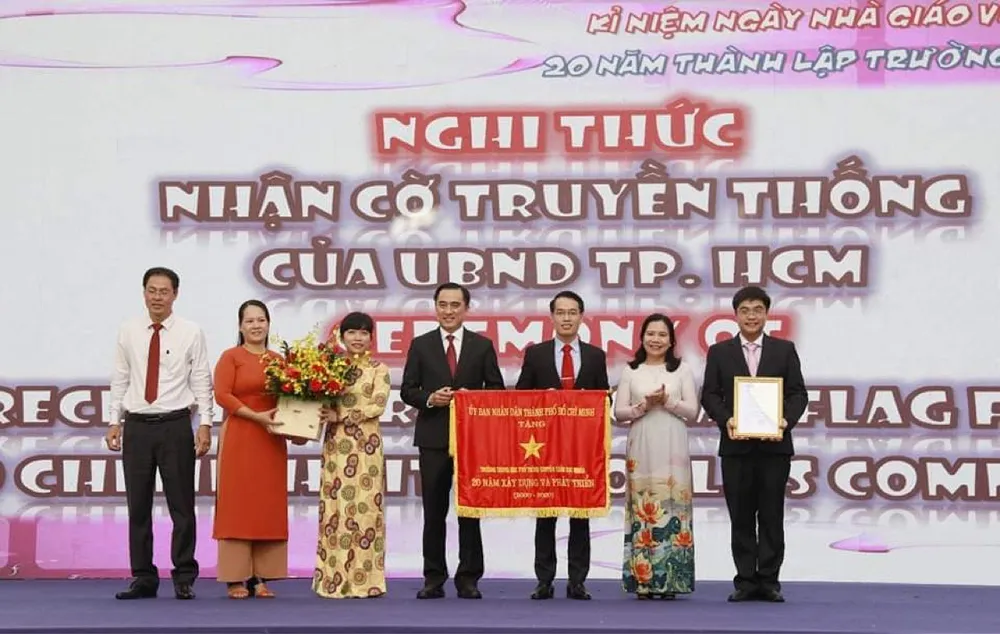 Ban giám hiệu nhà trường nhận Cờ truyền thống của UBND TP.HCM. Ảnh: NTCC