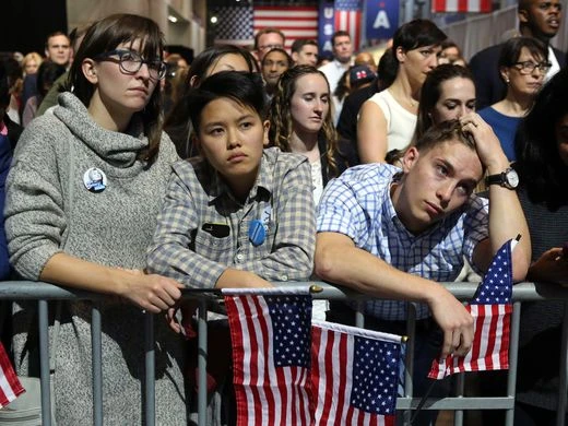 Người ủng hộ bà Clinton ủ dột trong đêm đón chờ kết quả kiểm phiếu sau ngày bầu cử trên toàn quốc.