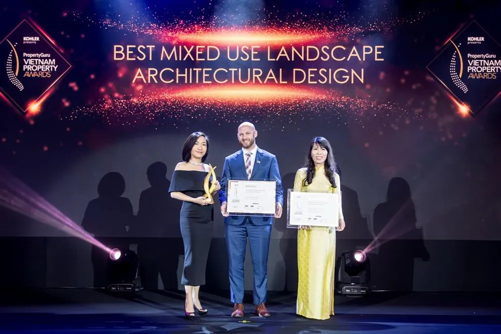 Bà Lê Thị Bích Ngọc (bên phải), Phó Tổng giám đốc Him Lam Land, nhận giải thưởng khu đô thị có Thiết kế kiến trúc cảnh quan đẹp nhất dành cho dự án Him Lam Green Park.