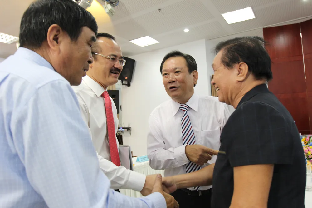 Phó chủ tịch Liên đoàn bóng đá Việt Nam Nguyễn Xuân Gụ trao đổi với Chủ tịch VPF Võ Quốc Thắng và nhà báo Nguyễn Công Khế (thứ tự từ phải sang).