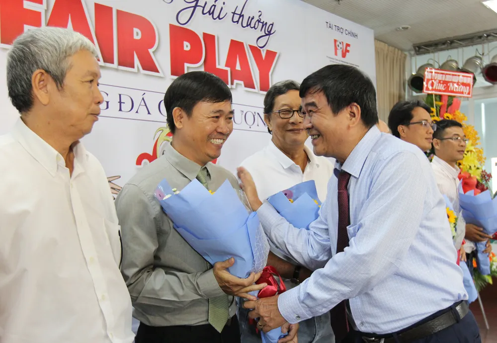 Ông Huỳnh Văn Hạnh - Giám đốc Sở Tư Pháp TP.HCM trao hoa cho các nhà tại trợ giải Fair Play 2017.