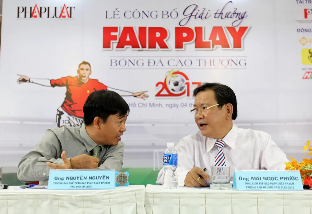 Ông Mai Ngọc Phước - Tổng biên tập báo Pháp Luật TP.HCM,Trưởng BTC giải Fair Play 2017 trao đổi với ông Nguyễn Nguyên - Trưởng ban thể thao báo Pháp Luật TP.HCM, Phó BTC giải.