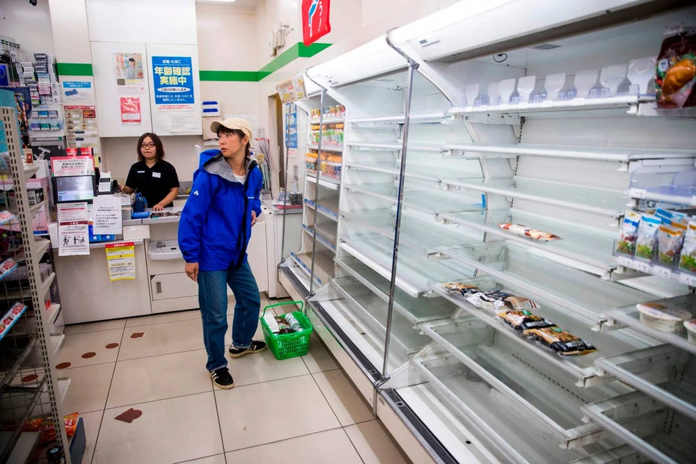 Hàng hóa trong cửa hàng tiện lợi ở quận Shinagawa, thủ đô Tokyo được người dân mua sạch để dự trữ. Ảnh: AFP