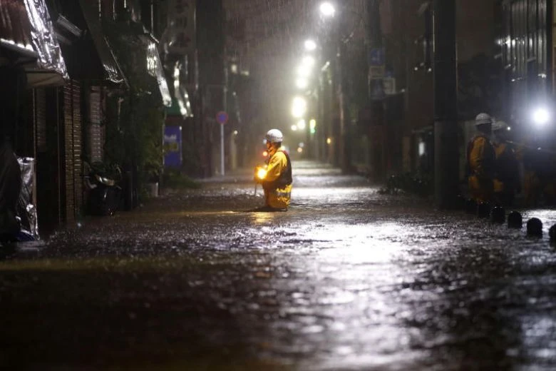 Nhân viên cứu hỏa tuần tra đường phố bị ngập vì bão Hagibis ở thủ đô Tokyo (Nhật) ngày 12-10. Ảnh: REUTERS