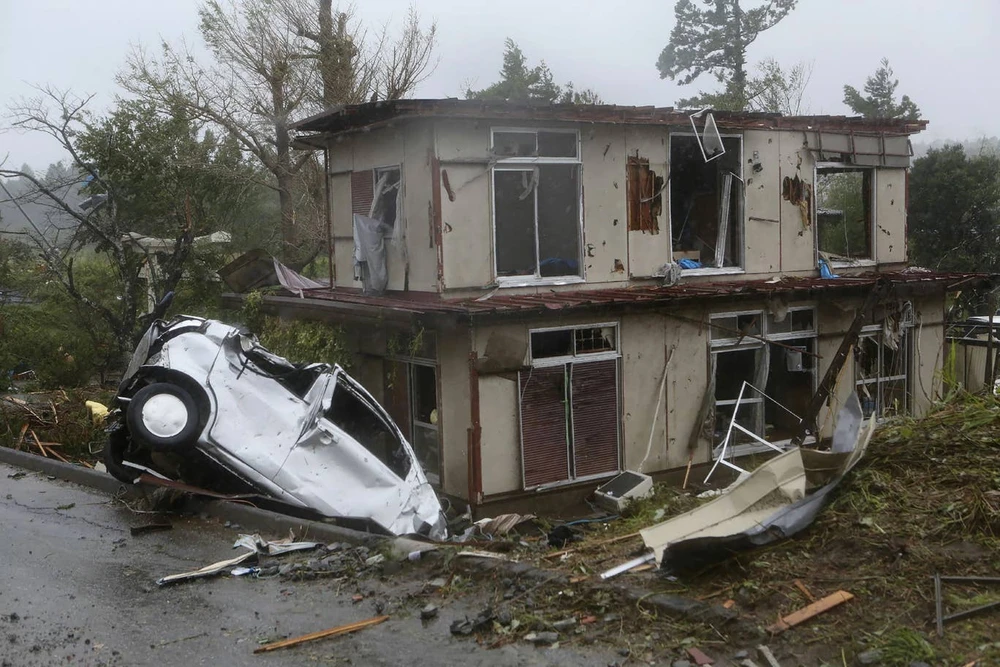 Xe cộ lật nhào xuống mương ngay cạnh một căn nhà bị hư hại nặng vì gió mạnh từ bão Hagibis ở TP Ichihara, tỉnh Chiba (Nhật). Ảnh: AFP