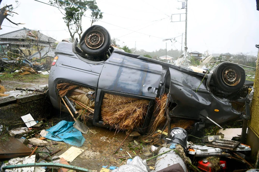 Xe lật nhào vì gió mạnh từ bão Hagibis ở TP Ichihara, tỉnh Chiba (Nhật). Ảnh: AP