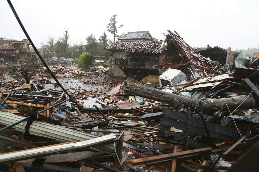 Nhà cửa, đường sá hư hại vì bão Hagibis ở TP Ichihara, tỉnh Chiba (Nhật) ngày 12-10. Ảnh: EPA